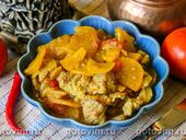Порежьте картофелины кружочками поставьте вариться в подсоленную воду. Степень проваривания картофеля определяйте кончиком острого ножа. Мягкую картошку извлеките из воды и уложите на плоское блюдо. Сверху уложите мясо. Блюдо готово!